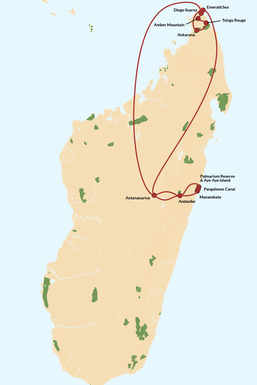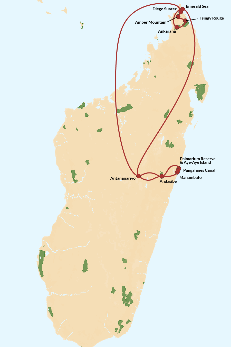 Enjoy this classic tour route through Northern Madagascar, featuring the Amber Mountain national park, Tsingy of Ankarana, Tsingy Rouge and the peerless Emerald Sea, before visiting the rainforests of Andasibe in central Madagascar. See tiny chameleons, otherworldly rock formations, hear the ethereal song of the Indri lemurs and take the chance to see the enigmatic Aye-Aye.